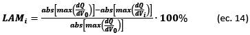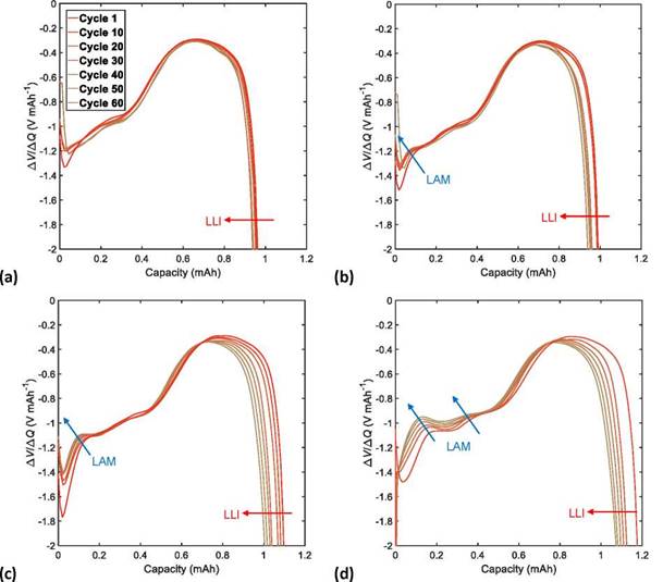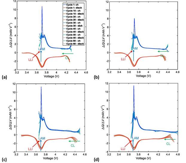 During the analysis of aging mechanisms through the quantification of DMs (LAM, LLI and CL), special attention was given to the curves of IC and DV during discharge, which is related to the amount of power, delivered during the cell operation.