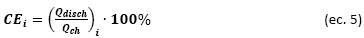 The CE of a cell is defined as a ratio of the amount of charge delivered during the discharge to the amount of charge stored during charging [32]. An average value can be calculated for the complete cycle life test: