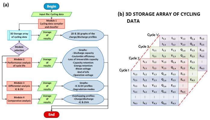 Figure 1. (a) Diagram of algorithm of the cycle life analysis tool and (b) cycling data storage process in a three-dimensional matrix.