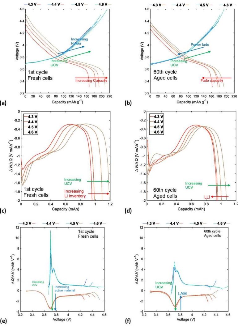 Complementary to the behavior observed on charge/discharge curves, superposition of the DV and IC curves at the beginning of cycling tests in Figures 10c and 10e, respectively, show that the application of high UCVs increases the amount of cyclable lithium and the proportion of cathodic active material. However, after 60 charge/discharge cycles, continuous cycling significantly increases the LLI and degrades a greater proportion of the cathode active material (LAM), as shown in Figures 10d and 10f.