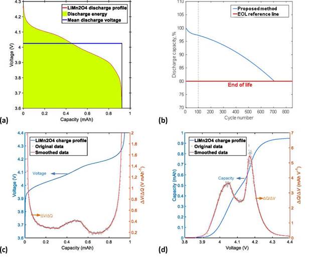 Figure 2. Examples of data processing, performed in the third module of the cycle life analysis tool, for a LiMn2O4 cell: (a) calculation of the average voltage; (b) proposed method for the estimation of EOL after 100 charge/discharge cycles; (c) smoothed data from the DV curve; and (d) smoothed data from the IC curve (for color figure see online version).