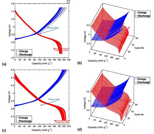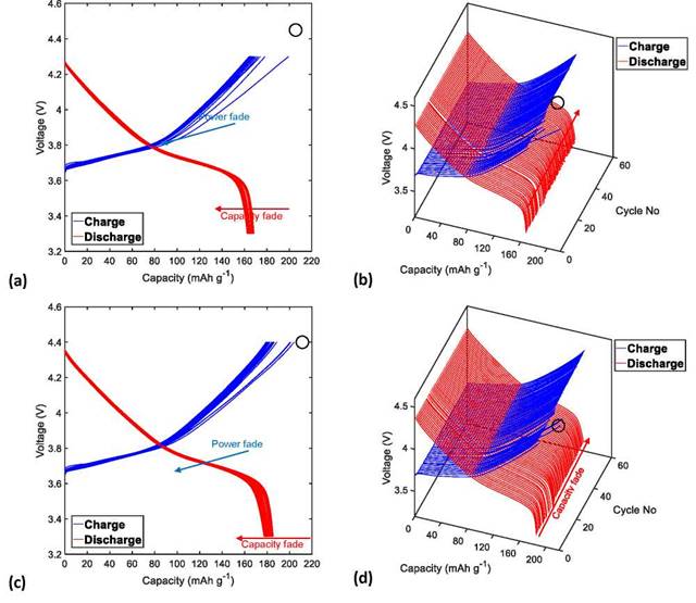 Figure 3. Charge and discharge profiles (in two and three dimensions) of the NMC622/Li half-cells cycled 60 times at C/3 at a temperature of 25°C with a UCV limit of (a)-(b) 4.3 V and (c)-(d) 4.4 V.