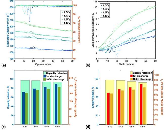 ICL is usually related to the increase in interna! resistances in the delithiation kinetics of charging process, which triggers CF during the charge/discharge cycles [7]. After the formation cycles, the first cycles of the NMC622/Li half-cells operated at UCVs of 4.3, 4.4, 4.5, and 4.6 V have similar ICLs of 2.18%, 2.38%, 2.42% and 2.88%, respectively. However, during the charge/discharge cycles, charge overpotential (i.e., impediment of delithiation) increases while the amount of delithiation (equal to charge capacity) is reduced, which causes a severe ICL, especially in the cells cycled at high UCVs; therefore, at the end of 60 charge/discharge cycles, ICLs were 4.94%, 5.9 %, 8.10%, and 10.1 %, respectively, as shown in Figure 5b.