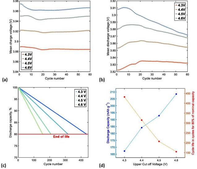 Table 3. Results of the cycle life performance analysis of the NMC622/Li half-cells at different UCVs