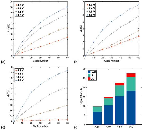 Figures 9a, 9b, and 9c show the growth of LAM, LLI, and CL, respectively, in the NMC622 cells with an increase in the number of charge/discharge cycles. A linear growth of the DM contribution to cell aging was observed in the increase of UCV (as shown in Figure 9d), where LAM was the dominant degradation mechanism of cell aging, followed by LLI, and finally CL. Accelerated aging was observed at high UCVs (4.6 V). This was mainly caused by a severe degradation of the cathodic active material (irreversible structural transformations), chemical and electrochemical oxidation of the electrolyte, and a constant loss of the available Li+ ions, in addition to a considerable loss of conductivity inside the structure of the cathodic coating. A fast CF and PF with low CR and ER dramatically shorten cycle life because of accelerated aging. On the other hand, a reduced effect of the degradation mechanism was observed at low UCVs (4.3 V); in this case, there was practically no contribution of CL to cell aging.