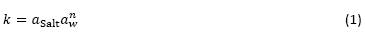 An equilibrium constant, k, for said equilibrium process is defined in terms of the activity of the anhydrous salt, a Salt, and the activity of water, a w , in the liquid phase: