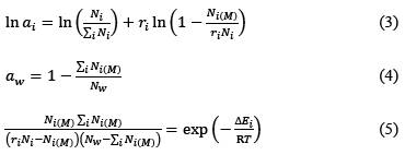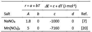 Where Ni and Nw are the number of moles of the ith salt and water, respectively, N i(M) is the coordination number of water associated with the ith salt, T is the absolute temperature, R is the constant universal of gases, r i and ∆E i are binary model fitting parameters and are corresponding to the ith salt. These parameters depend weakly on temperature and are given in the literature for several inorganic salts. In Table 2, these parameters are given for the salts of the NaNO3-Mn(NO3)2-H2O system at 25 °C and it can be seen that they do not depend on the temperature in this case.