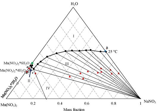 In the phase diagram of the NaNO3-Mn(NO3)2-H2O system at 25 °C constructed with the experimental data obtained, Figure 1, the area above the solubility curve, I, represents the field of existence of solutions unsaturated liquids, region II, saturated liquid solutions in equilibrium with Mn(NO3)2·4H2O crystals, region III, is similar but with NaNO3 crystals, and area IV represents saturated liquid solution in equilibrium with two crystals, a namely, NaNO3+Mn(NO3)2-4H2O. Points a and b represent the binary solubility of the systems Mn(NO3)2-H2O and NaNO3-H2O, respectively, and the point c is an invariant where the system is saturated with both saline solutes. Note that crystallization area II is small compared to area III, this is because Mn(NO3)2-4H2O is more soluble than NaNO3.
