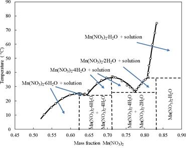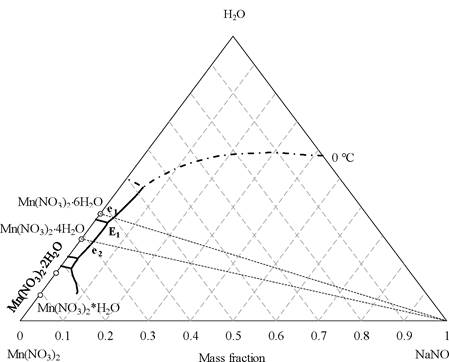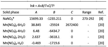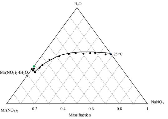 Recently, a eutectic mixture formed by 96.5 mass % Mn(NO3)2-6H2O and 3.5 mass % NaNO3 was experimentally determined by the differential scanning calorimetry (DSC) method for its application as PCM in buildings [12]. The use of Mn(NO3)-6H2O was not only suggested as PCM for thermal energy storage for cooling systems in the literature [13], but was also used as a source of manganese in the preparation of LiMn2O4 cathode materials for Lithium-ion batteries [14], so the study of the properties of this salt and its mixture are important. Solubility data of the NaNO3-Mn(NO3)2-H2O ternary system at 25 °C were not yet reported in the literature.