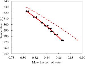 Due to the fact that the parameters of the BET model as the equilibrium constants for the NaNO3-Mn(NO3)2-H2O system are known, the model can be used for the analysis of experimental and theoretical results. In this sense, the phase diagram of the binary system Mn(NO3)2-H2O was previously predicted in this work by applying the general calculation procedure described in Section 3; these results are compared with the experimental results given in the literature [24], see Figure 2, both are consistent, they were also demonstrated by Zeng et al [20]. Note that by drawing a horizontal line at 25 °C in the phase diagram (Figure 2), this line is above the calculated eutectic temperature line, 24.3 °C (the experimental one is 24.7 °C). However, the experimental data taken from Linke and Seidell [24], being discrete experimental information, indicate that only the Mn(NO3)2-6H2O phase is formed at 25 °C. As the model provides continuous information, it is known that the system also forms the solid phase Mn(NO3)2-4H2O as can be verified by simple inspection of the phase diagram.