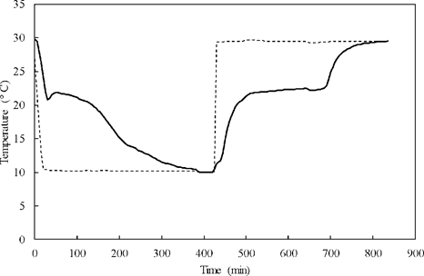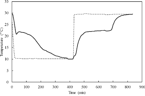 Figure 6. Temperature change curve of PCM and water in the NaNO3-Mn(NO3)2-H2O system. (-), eutectic mixture; (--), water.