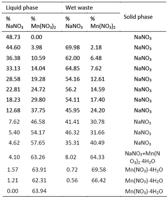 The mixtures prepared above were stirred for 72 h which corresponds to a reasonable equilibrium time to reach solid-liquid phase equilibrium at 25 °C. This time was previously determined by measuring the density of a given mixture as a function of time until the property is constant. After 72 h, the system stops and the mixtures are allowed to decant for 12 h, maintaining a constant temperature. Then, for each solid-liquid mixture, a sufficient portion of liquid is extracted with the help of a syringe and a micro filter (0.45 µm porosity) for the analysis of sodium, manganese and nitrate. The solid phases are left with a little supernatant liquid for analysis in the same elements. Sodium and manganese were analyzed by atomic absorption spectrophotometry with direct air-acetylene flame aspiration, while nitrate by ultraviolet-visible absorption spectroscopy.