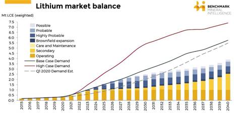 Figura 1. Proyectos en desarrollo y demanda proyectada a nivel mundial de LCE hasta el 2040. Fuente: (The Limiting Factor, 2023)