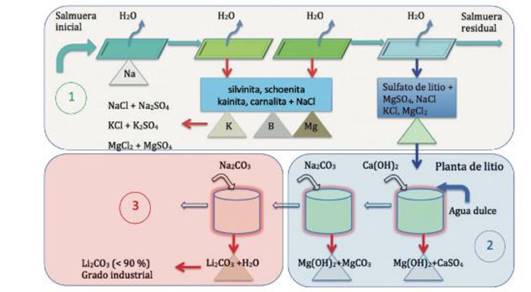 Además, se describieron los procesos clave involucrados en la producción de Li2CO3, incluyendo las etapas de extracción de salmuera, evaporación solar, purificación química y precipitación final (Schenker et al., 2022)