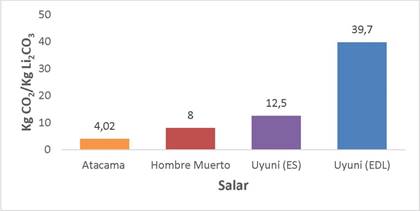 El proceso de producción de Li2CO3 en el Salar de Uyuni genera una huella de carbono de 12,5 kg CO2/kg Li2CO3, significativamente mayor que la de otros salares, como Atacama (4,02 kg CO2/kg Li2CO3) y Hombre Muerto (8,0 kg CO2/kg Li2CO3) (Schenker & Pfister, 2024). Esta diferencia se debe a:
