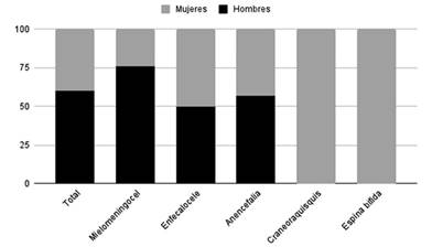 Los tipos de DTN más frecuentes fueron mielomeningocele (sin localización especificada en el registro), encefalocele occipital, anencefalia, craneoraquisquisis y espina bífida oculta. Cuadro 3. La distribución de los casos de DTN por sexo mostró una razón de sexo: 1.64:1. La distribución por sexo por distintos tipos de DTN muestra predilección por el sexo masculino para mielomeningocele y anencefalia (75% y 57.14% respectivamente), mientras que la craneoraquisquisis y espina bífida en el sexo femenino y una distribución similar para ambos sexos en encefalocele occipital, tal como se observa en el cuadro 4 y figura 2.