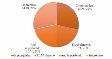 En relación a los casos coexistentes con otras AC, se observó su presencia en cromosomopatías, como síndrome de Down en 2 casos (7,14%), 2 (7,14%) síndrome de Patau. 4 casos (14,28%) se presentaron junto a criptorquidea, 3 (10,71%) junto a fisuras labiopalatinas unilaterales, 3 (10,71%) junto a malformaciones anorectales, y 4 casos de hidrocefalia (como consecuencia). Figura 4.