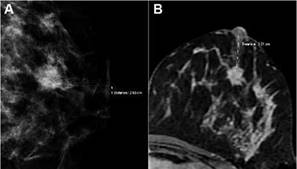Figura N° 1 A) Mamografía izquierda, proyección cráneo-caudal. Nódulo espiculado retroareolar a 25 mm del CAP. B) Resonancia magnética de la misma paciente, secuencia T1 postcontraste. Nódulo retroareolar izquierdo, con características de malignidad a 22 mm del CAP. Diagnóstico anatomopatológico: Carcinoma ductal infiltrante. Se realizó cirugía conservadora sin datos de afectación del CAP.