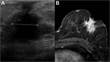 Figura N° 2 A) Ecografía mamaria izquierda. Neoplasia mamaria que invade el pezón. B) Resonancia magnética, secuencia T1 postcontraste contraste de la misma paciente. Realce tumoral homogéneo retroareolar con extensión al CAP. Diagnóstico anatomopatológico: Carcinoma ductal apocrino infiltrante con invasión del pezón