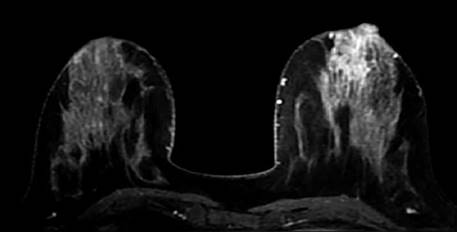 Figura N° 3 Resonancia magnética mamaria, secuencia T1 postcontraste. Realce no masa retroareolar izquierdo con marcado realce del CAP. Diagnóstico anatomopatológico: Carcinoma ductal infiltrante con afectación del pezón