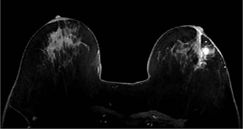 La resonancia magnética es una técnica valiosa en la evaluación del cáncer de mama por su mayor sensibilidad y alto valor predictivo negativo. (27) Sus principales indicaciones están dirigidas a la evaluación de la respuesta al tratamiento neoadyuvante, al cribado de mujeres con alto riesgo y la estatificación local del cáncer de mama. (28) La RM con contraste dinámico se ha establecido como la principal técnica de imagen para confirmar o descartar el compromiso del CAP por el cáncer de mama. (29) Los hallazgos se estudian con múltiples secuencias utilizando reconstrucciones axiales y sagitales.