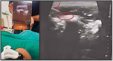 Paciente femenina de 52 años de edad, ingresa a urgencias por cuadro abdominal; valorada por el servicio de cirugía general y programado para colecistectomía laparoscópica vs abierta con el diagnóstico de colecistitis aguda litiásica. Durante la valoración preanestésica, paciente refiere antecedentes de: insuficiencia cardiaca (IC), hipertensión arterial pulmonar (HAP), estenosis mitral (EM) e insuficiencia tricuspídea (IT); en tratamiento con digoxina y carvedilol. Al examen físico peso registrado 84 Kg y talla 1.54 metros (IMC 36.7 KG/m2); signos vitales: presión arterial (PA) de 94/54mmHg, frecuencia cardiaca (FC) 67lpm, frecuencia respiratoria (FR) 22rpm, SpO2 86% con aporte de oxígeno a 3 L/min por cánula nasal; hallazgos positivos fueron: disnea a medianos esfuerzos, soplo sistólico mitral III/IV, estertores crepitantes en ambas bases pulmonares, hepatomegalia (2cm del reborde costal) y edema en ambas piernas fóvea (+++); parámetros de vía aérea: apertura oral 4cm, edéntula, Mallampati Samsoon III, distancia tiromentoniana > 6.5cm distancia esternomentoniana 11cm y Bellhouse Dore I. Los exámenes de laboratorios reportaron Hemoglobina 13.7g/dL, Hematocrito 40.6%, química sanguínea y coagulograma sin alteraciones. La ecocardiografía reportó área valvular mitral 0.8 cm2, dilatación de aurícula izquierda, dilatación de cavidades derechas, y derrame pericárdico leve. Al ingreso a quirófano la monitorización inicial (monitor SPACELABS Healthcare Ultraview SL™) registró una PA 106/71mmHg, FC 70lpm, FR 22rpm, SpO2: 88%. Se inició perfusión de noradrenalina a 0.05ug/kg/min por vía periférica y, en posición en rampa se realizó inducción anestésica con fentanil 150ug intravenoso (IV), propofol 100mg, ketamina 50mg IV y rocuronio 35mg IV (0.6mg/kg). Se realizó intubación endotraqueal sin complicaciones al primer intento. Se conectó a ventilador mecánico (General Electric Carestation 750), se programó ventilación controlada con volumen corriente (VC) 350ml, frecuencia ventilatoria (FV) 20- 24vpm, relación inspiración:espiración 1:3, PEEP 8cmHO2, FiO2 70%, obteniendo presión meseta o plateu (Pmest o Pplat) 22cmH2O y presión de distensibilidad (driving pressure (DV)) 14cmH2O. Posterior a esta, se evidenció ausencia de expansión torácica, del murmullo vesicular y de la onda de capnografía; por lo que se procedió a la administración de hidrocortisona 100mg IV y salbutamol 6 puff por tubo endotraqueal (TET) con respuesta satisfactoria y reversión de signos de broncoespasmo. Se realizó bloqueo del erector de la espina ecodirigido (Ecógrafo Butterfly iQ+™) a nivel del proceso transverso de T7 con 20 ml de bupivacaina al 0.25% (FIGURA 1).