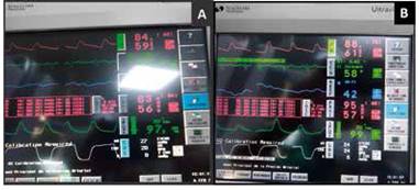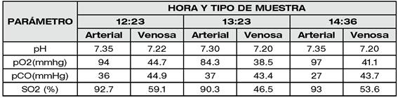 Se instaló línea arterial radial izquierda y catéter venoso central (CVC) subclavio. El mantenimiento de la anestesia se realizó con sevofluorano 1%-1.5%, fentanil y rocuronio a demanda. Durante el transoperatorio mantuvo una FC entre 60 - 70lpm y la PAM entre 57 - 67mmHg (FIGURA 2) con soporte vasopresor (noradrenalina 0.05-0.2ug/kg/min) por CVC. Se realizaron gasometrías arteriales y venosas para el control de la pCO2 y la SvO2 (TABLA 1). Concluido el procedimiento quirúrgico, la extubación se efectuó sin complicaciones previa administración de 6 puff de salbutamol por TET y lidocaína 2% 80mg IV. Como coadyuvantes se administraron ácido tranexámixo 1g IV, metoclopramida 10mg IV, dexametasona 8mg IV, paracetamol 1g IV y albúmina 20% 100ml IV. El balance hídrico fue negativo (92mL) con flujo urinario de 0.8mL//kh/h. Paciente pasó despierta y estable a la Unidad de Recuperación Postanestésica (URPA) y posteriormente a sala de internación del servicio de cirugía.