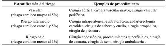 El riesgo relacionado con la cirugía está determinado por el tipo y duración del procedimiento quirúrgico, además de la urgencia de la operación. La estimación del riesgo quirúrgico es un cálculo aproximado del riesgo de muerte cardiovascular, infarto de miocardio e ictus a los 30 días asociado a un procedimiento quirúrgico específico y no tiene en cuenta las comorbilidades de los pacientes9(CUADRO 2). La cirugía laparoscópica, comparada con la cirugía abierta, no reduce el riesgo cardiovascular de pacientes con enfermedad cardiovascular y se debe evaluar ambas opciones de la misma forma6.