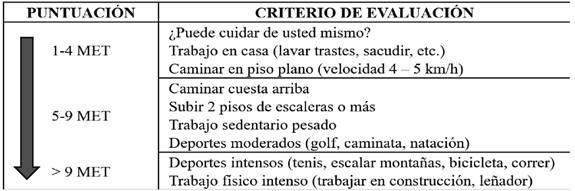 La evaluación de la capacidad funcional (CUADRO 3) aporta información sobre la posibilidad de complicaciones cardíacas y necesidad de profundizar en estudios diagnósticos10,11. Pacientes con buena clase funcional (es decir >4 MET), pueden proceder con la cirugía programada sin necesidad de estudios adicionales o nueva terapia farmacológica. En pacientes con capacidad funcional baja (es decir <4 MET), si la cirugía es de riesgo intermedio (1 a 5%) además de la optimización médica preoperatoria, se recomienda llevar al procedimiento quirúrgico sin estudios adicionales4.