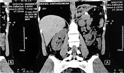 Paciente femenina de 36 años de edad, referida del servicio de gastroenterología, con cuadro clínico de dolor abdominal postprandial, en epigastrio de moderada intensidad, cólico, irradiado a región costal izquierda, además de disnea de grandes esfuerzos; por lo que asume posición antialgica en decúbito lateral izquierdo con extensión superior de miembro superior derecho; distensión abdominal progresiva, náuseas y vómitos alimenticios no cuantificados. Hiporexia y malestar general. Sintomatología que se exacerba 1 semana previa a consulta, acudiendo en 2 oportunidades a la emergencia.