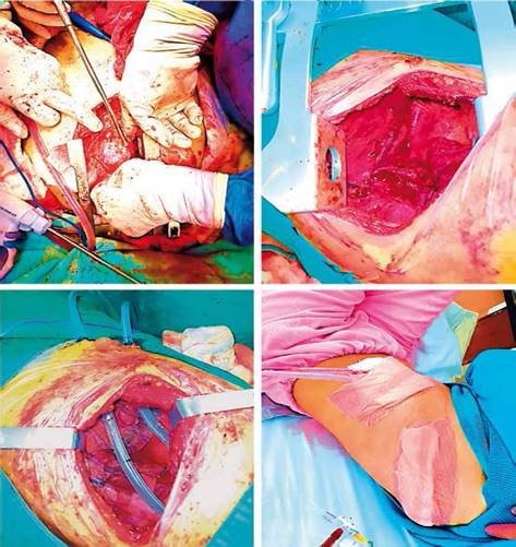 • Por excesiva fibrosis, falta de plano de clivaje y lasitud de diafragma, se procede a plicacion con prolene 1 puntos simples (FIGURA 3-B), instalación de malla de polipropileno y tubos de pleurostomia izquierdos (FIGURA 3-C). Fin de procedimiento sin complicaciones, paciente pasa a UTI (FIGURA 3-D)