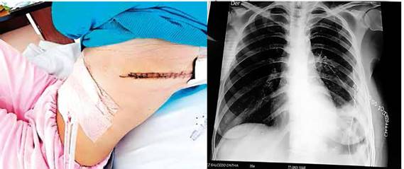 Durante PO inmediato y mediato no hubo eventualidades; pasó a sala de cirugía posterior a estar 3 días en UTI. Se mantuvo manejo endovenoso de medicación además de controles laboratoriales con gran mejoría; se inicia dieta al 5to día PO, además de RX de tórax de control sin hallazgos patológicos. Se efectuó interconsulta con fisioterapia quien inicia terapia ventilatoria tanto activa como pasiva. Es dada de alta 7mo día en buenas condiciones (FIGURA 4).