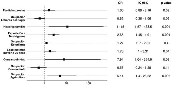 Respecto a los factores de riesgo para AC, se encontraron significativos varios elementos en la regresión logística univariada (Figura 1). Estos incluyen FR genéticos como el historial familiar de AC, consanguinidad, FR ambientales como la exposición a distintos agentes durante la gestación, la ocupación materna en el sector agrícola y la edad materna superior a 35 años.
