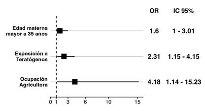 Posteriormente, estos factores fueron incorporados en el modelo de regresión logística multivariada (Figura 2). En este análisis más detallado, se identificó que la edad materna superior a 35 años, exposición a agentes ambientales durante la gestación y la ocupación materna en agricultura mantenían su significancia estadística. Es importante destacar que, en todos los casos reportados de exposición a agentes ambientales durante la gestación, los agentes implicados fueron los pesticidas.