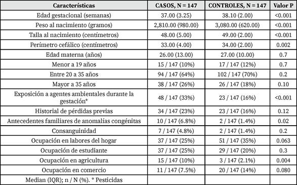 A lo largo de la duración del estudio se recopiló una muestra compuesta por 147 casos y 147 controles, lo que corresponde a un porcentaje de 1.59% (IC95%: 1.35 - 1.87) de todos los recién nacidos. La descripción general de los datos de la muestra se presenta detalladamente en la Tabla 1, en la que se puede observar una diferencia estadísticamente significativa (DES) en los indicadores antropométricos de casos con mayor tendencia a retraso generalizado del desarrollo y edades gestacionales menores.