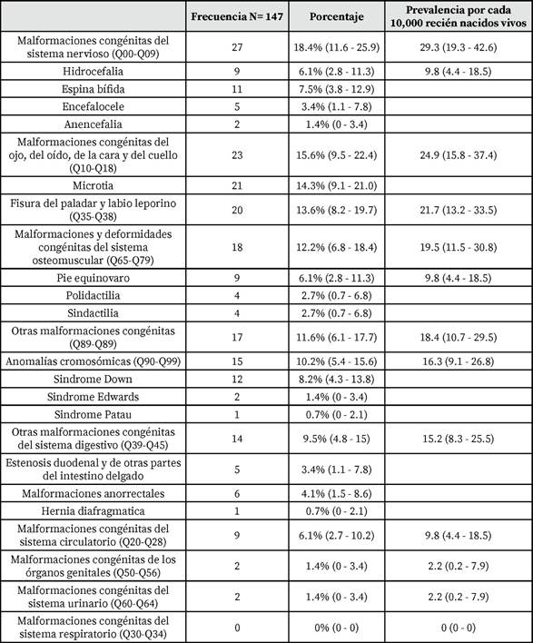 Tabla 2. Descripción de las anomalías congénitas encontradas en el estudio según la Clasificación internacional de enfermedades 10ma edición. Fuente: Elaboración propia.