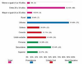 De las 82 pacientes con ISQ Post-Cesárea, las características socio-demográficas que se presentaron con mayor frecuencia fueron, procedencia (urbana) con 91.46%, edad (20 a 34 años) con 82.93%, nivel educativo (secundaria) con 52.44% y estado civil (unión estable) con 41.46% (Figura 1).