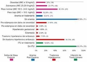 De las 82 pacientes con ISQ Post-Cesárea, las características clínicas que se presentaron con mayor frecuencia fueron, sin anemia post cesárea con 86.59%, sin infección de tracto urinario con 85.37%, sin trastorno hipertensivo del embarazo con 59.75% y peso normal con 45.12% (Figura 2).