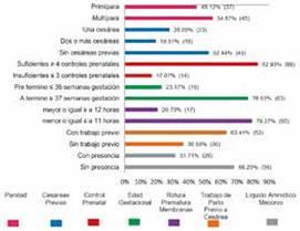 De las 82 pacientes con ISQ Post-Cesárea, las características obstétricas que se presentaron con mayor frecuencia fueron, controles prenatales suficientes ≥ 4 con 82.93%, rotura prematura de membranas menor o igual a 11 horas con 79.27%, edad gestacional a término ≥ 37 semanas gestación con 76.83%, sin líquido amniótico meconial con 68.29%, con trabajo de parto previo a la cesárea con 63.41%, multípara con 54.87% y sin cesáreas previas con 52.44% (Figura 3).