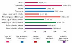 De las 82 pacientes con ISQ Post-Cesárea, las características quirúrgicas que se presentaron con mayor frecuencia fueron, cesárea de emergencia con 74.39%, tiempo quirúrgico menor o igual a 59 minutos con 71.05%, perdida hemática menor o igual a 499 mililitros con 62.20%, incisión quirúrgica transversa con 58.54% y estancia hospitalaria post-cesárea menor o igual a 3 días con 54.88% (Figura 4).
