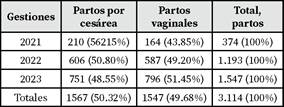 El Hospital del Norte - El Alto durante el 1 de enero de 2021 al 31 de diciembre del 2023 ingresaron 3.114 gestantes para la atención de su parto de las cuales 50.32% fueron partos por cesárea y 49.68% fueron partos vaginales (23) (Cuadro 1).