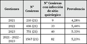 Cuadro 2. Prevalencia de infecciones de sitio quirúrgico en pacientes post cesárea del Hospital del Norte - El Alto, gestiones 2021 - 2022 - 2023