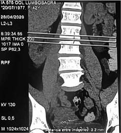 Fig 1. TAC de columna lumbar: corte coronal de tomografia con ventana para plano blandos, evidencia escoliosis levoconvexa con disminución en la altura de discos en todos los niveles