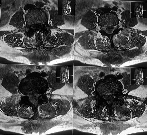 Fig 3. RMN cortes axiales de columna lumbosacra potenciada en T1 muestra colección mal definida, de contornos irregulares, heterogénea, de predominio hipointensa, localizada en plano de tejido celular subcutáneo que contacta con plano muscular y apófisis espinosa de L2, L3, y L4