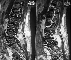 Al cuadro se suma alzas térmicas hasta 38,5 ° que ceden con paracetamol de forma parcial, taquicardia persistente y clínicamente presencia de fluctuación del nódulo proveniente de la línea media de la espalda por lo que se desde realizar una resonancia magnética de columna lumbosacra en la cual se observa colección en planos superficiales posteriores (paraespinosos), y otras colección que se dirige hacia canal medular a nivel de L4-L5, además de protrusión discal L4-L5 subarticular derecha sin compromiso radicular y protrusión discal subarticular derecha de L5-S1 con compromiso radicular ipsilateral, hiperdensidad de apofisis espinosas de L3-L4.