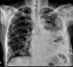Se realizó radiografía simple de tórax que mostró imágenes compatibles con el signo de “suelta de globos” en todos los campos pulmonares, junto con derrame pleural izquierdo (Figura 1).