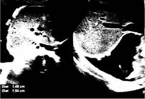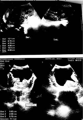 Se completó el estudio con ecografía abdominal, que evidenció múltiples nódulos hepáticos (Figura 2). La ecografía renal y vesical mostró una lesión medular derecha de aproximadamente 7 cm, sugestiva de proceso neoplásico (Figura 3).