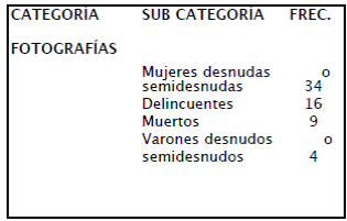 Las fotografías que ilustran el periódico presentan una mayor frecuencia de mujeres desnudas o semidesnudas, seguido muy de lejos por las que presentan delincuentes, muertos y en último lugar los varones desnudos o semidesnudos.