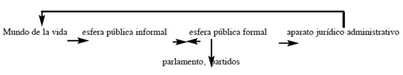 Según el modelo de Habermas la comunicación política es el nexo que une las esferas del mundo de la vida, la esfera pública informal, la esfera pública formal y el aparato jurídico administrativo y su relación va en ambos sentidos. El circuito de comunicación funciona de esta manera