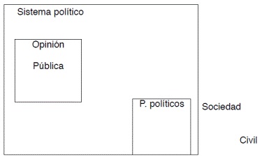 Al no reconocer el espacio de la sociedad civil como independiente de la esfera política, la opinión pública es parte de este sistema y no el reflejo de la sociedad. La reducción de la complejidad de los procesos de comunicación que la lleva a cabo se da entonces a nivel de los temas y no de las opiniones, y depende de la capacidad de los temas para estructurar el proceso de comunicación (RABOTNIKOF 1997: 60).